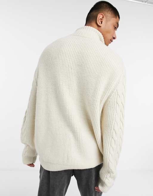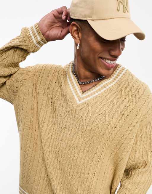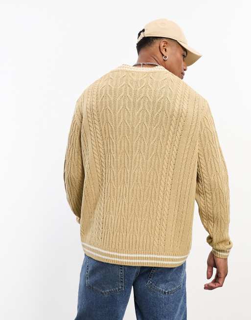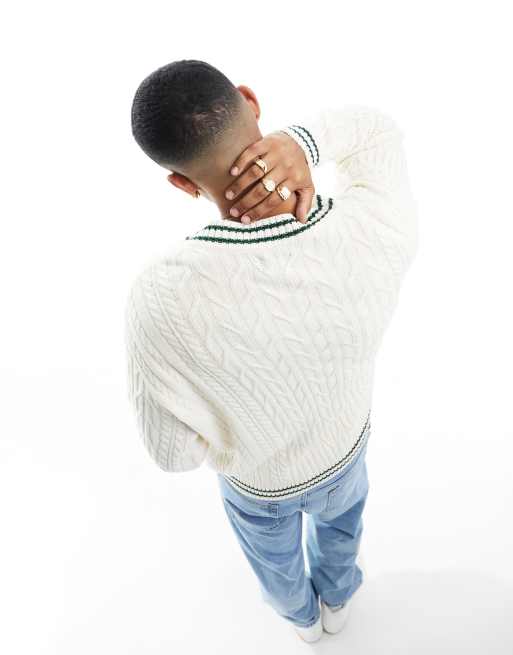 Asos Design Oversized Cable Knit Cricket Sweater In Oatmeal White Tipping Asos